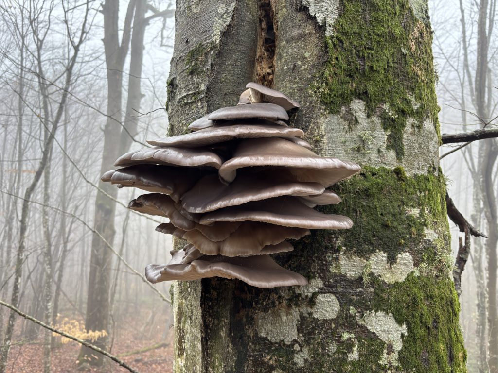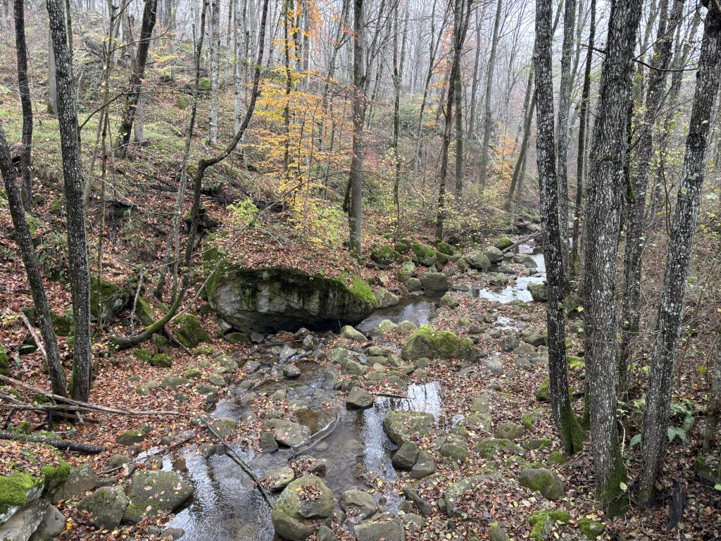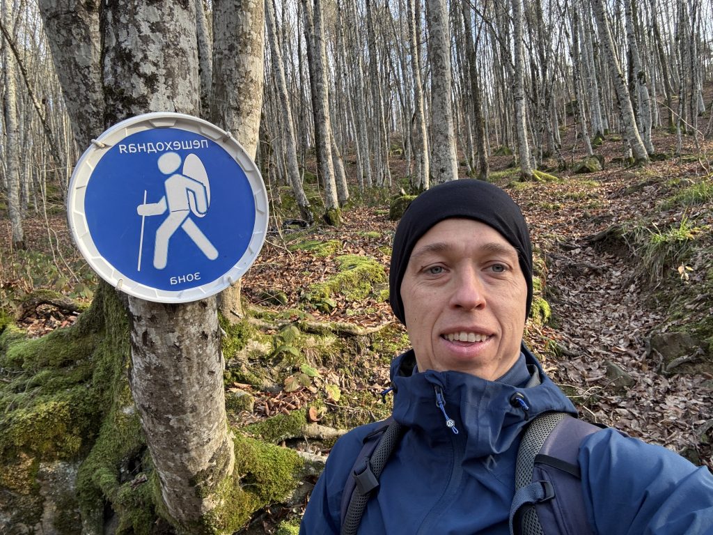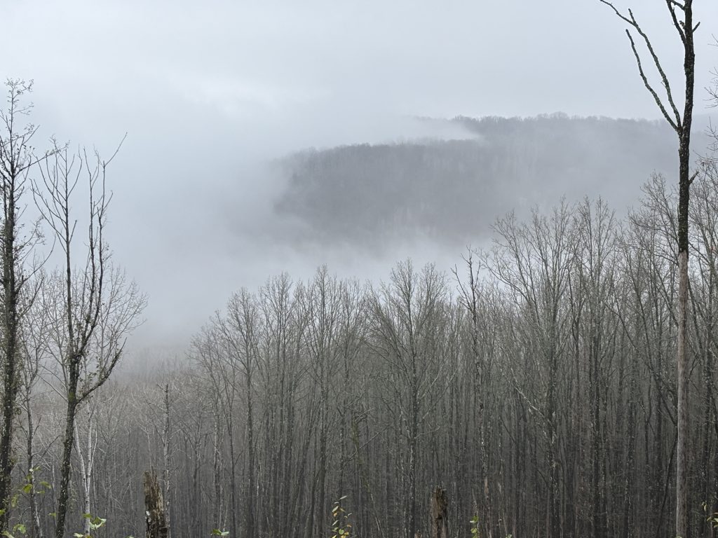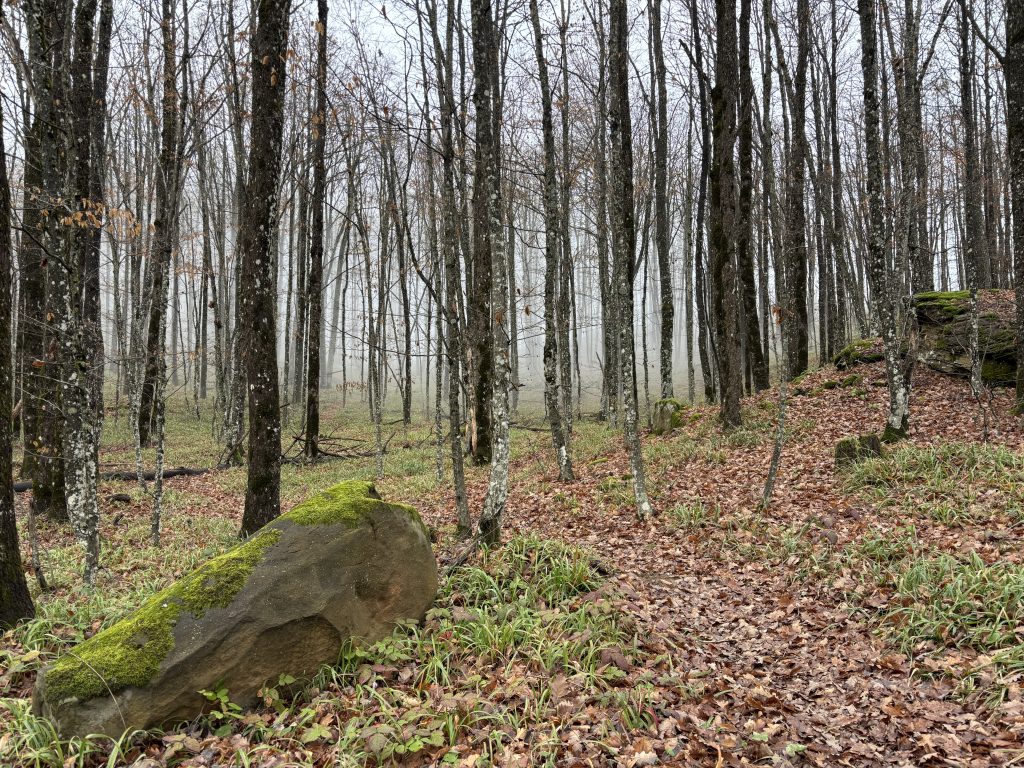 Спустя час я дошел до распаханной зачем-то посреди леса поляны, после которой начался затяжной подъем. Туман стал гуще, но периодами вдруг исчезал, и тогда я мог сделать несколько памятных снимков. К вершине горы, когда до перевала оставалось идти не более двадцати минут туман вдруг совсем рассеялся, давая надежду увидеть Собер Баш, но прямо у вершины остановился. Было странно видеть границу тумана в лесу, хотя такое явление в этих местах я уже кажется видел. Я зашел за его пелену, пытаясь понять, где же впереди обрыв.