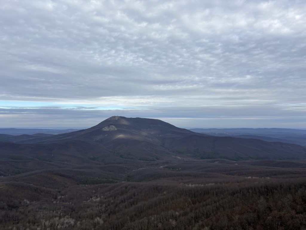 Температура была на пару градусов ниже нуля, но во время подъема в гору я не замерзал и спустя час вышел на перевал. Здесь стояла очень удобная беседка (разумеется в густом тумане в прошлый раз я ее не заметил!) и в глаза бросался потрясающий вид на “Собер-Баш”, который с этой точки обзора был как на ладони. Я сварил чаю и стал обедать, периодически подливая кипятка и курсируя с бутербродом в одной руке и кружкой чая в другой между беседкой и краем обрыва. Лес был голым и в нем отчетливо были видны тропа, ведущая к горе “Собер-Баш”.